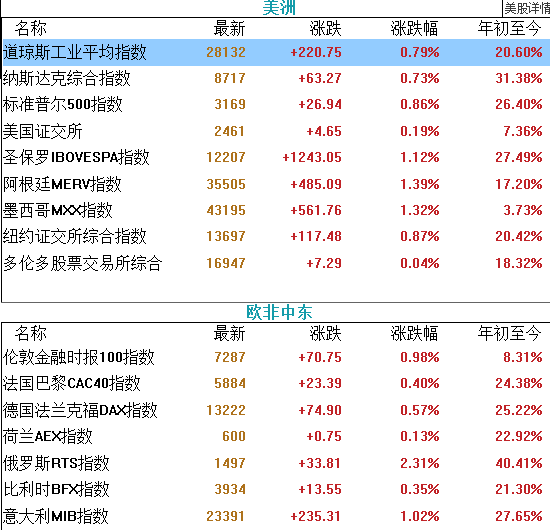 隔夜,美国股市开盘后大幅拉升,截至收盘,道指上涨220.75点,涨幅0.79%,报28132.05点,纳指涨0.73%,报8717.32点,标普500指数涨0.86%,报3168.57点,三大股指两周来首次齐创盘中历史新高,最终纳指和标普500指数联袂刷新收盘历史新高。CBOE恐慌指数VIX下跌7%,报13.94。