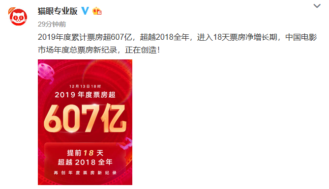 据猫眼数据,截至12月13日18时15分,2019年中国电影市场总票房达到607亿,超过2018年的总票房成绩,创造中国电影市场年度总票房新纪录。