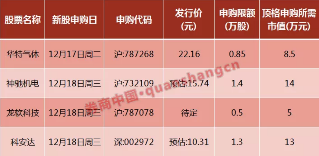 本周共有4只新股申购,分别是华特气体(688268.SH)、神驰机电(603109.SH)、龙软科技(688078.SH)、科安达(002972.SZ),申购日期主要集中在周二和周三。