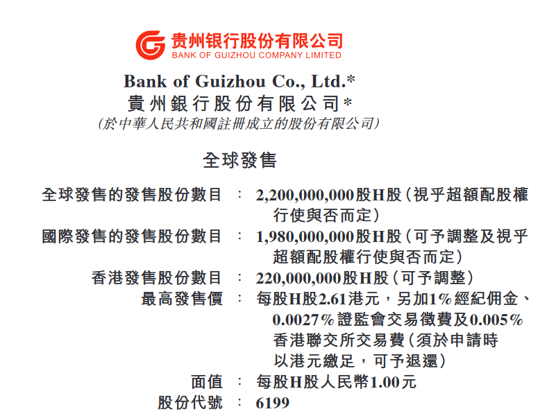 12月16日,贵州银行在港交所发公告称,公司将于12月16日-19日招股,拟发行22亿股H股,其中公开发售2.2亿股,国际发售19.8亿股,每股发行价2.46港元-2.61港元,每手1000股,预计将于12月30日上市。
