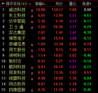 周三早盘,操作系统概念股异动拉升。截至发稿,诚迈科技涨停,东土科技涨6.65%,达华智能涨5.36%,卫士通、浪潮信息等多股跟涨。