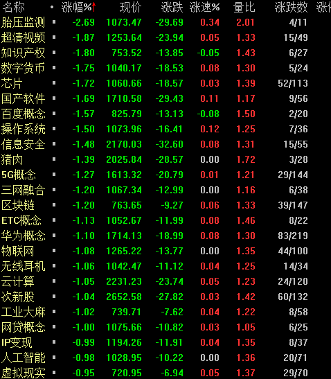 周一早盘,大科技板块集体下挫。截至发稿,之前大热的胎压监测、超清视频、芯片、国产软件、操作系统以及5G等概念板块跌幅均超过1%。