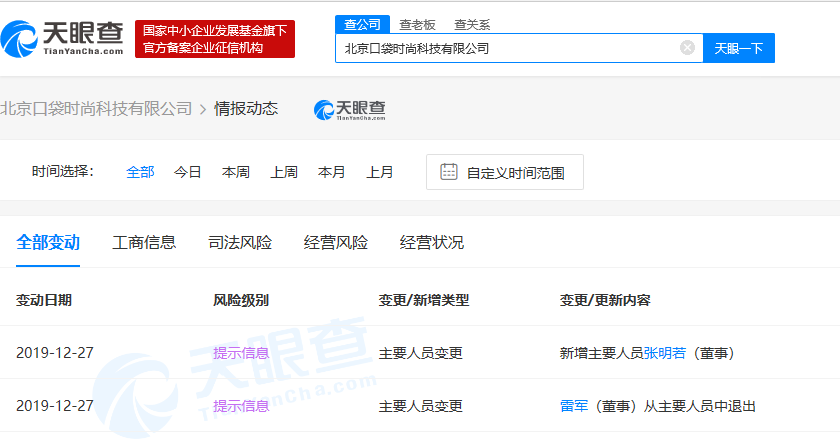 天眼查数据显示,12月25日,微店的运营主体北京口袋时尚科技有限公司发生工商变更,雷军卸任该公司董事一职。北京口袋时尚科技有限公司成立于2011年5月,注册资本为1000万人民币,法定代表人为董事长王珂,经营范围包括销售电子产品、家用电器、服装等。