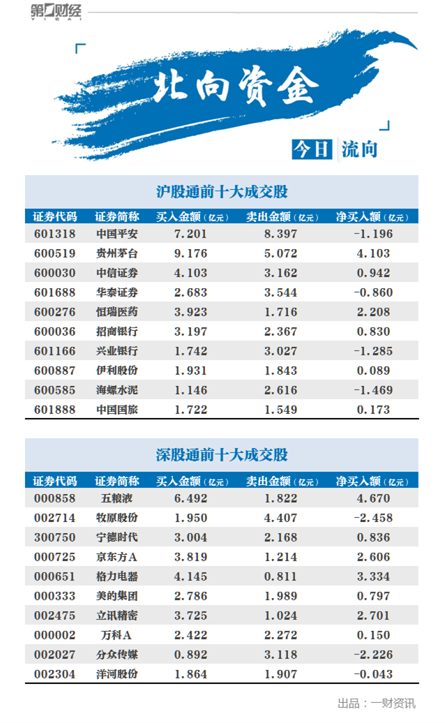前十大成交股中,五粮液、贵州茅台、格力电器分别获净买入4.67亿元、4.1亿元、3.33亿元。牧原股份、分众传媒、海螺水泥分别遭净卖出2.46亿元、2.23亿元、1.47亿元。