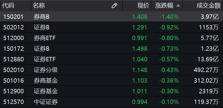 而另一方面,昨日大涨的券商板块跌幅靠前,场内基金中,券商B(150201.SZ)跌超1%,券商ETF(512000.SH)、证券B(502012.SH;150172.SZ)、证券ETF(512880.SH)以及证券基金(512900.SH)等均逆市回调。