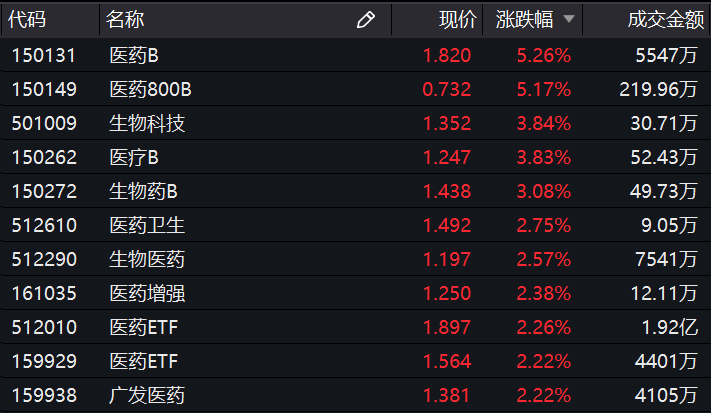 2019年收官之战,医药板块表现强势,鲁抗医药(600789.SH)、香雪制药(300147.SZ)等纷纷涨停,场内基金也涨幅靠前。具体来看,医药B(150131.SZ)涨超5%,生物医药(512290.SH)、医药ETF(512010.SH;159929.SZ)以及广发医药(159938.SZ)等涨幅均超2%。