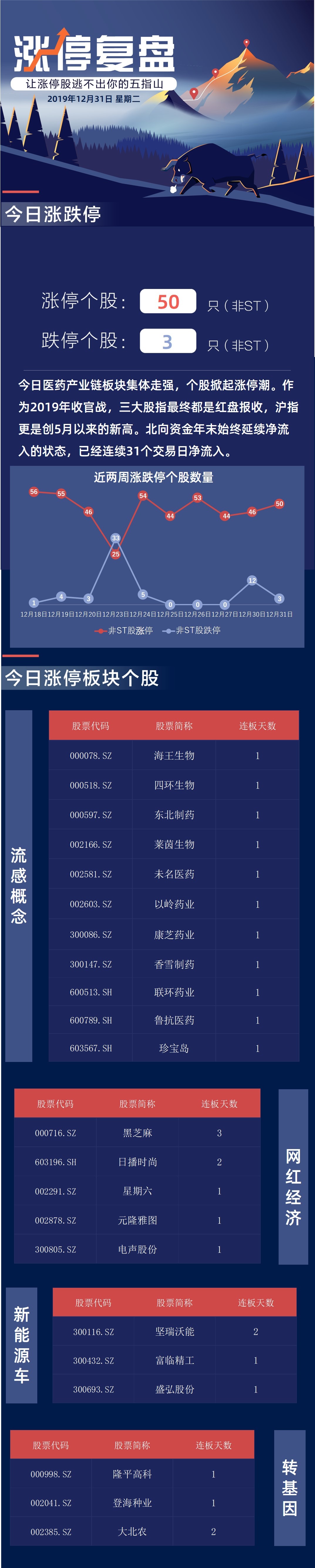 今日病毒防治股领衔,医药产业链板块集体走强,个股掀起涨停潮。作为2019年收官战,三大股指最终都是红盘报收,沪指更是创5月以来的新高。向资金年末始终延续净流入的状态,已经连续31个交易日净流入。