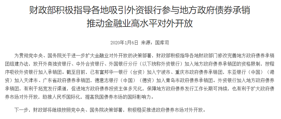 1月6日财政部消息,为贯彻党中央、国务院关于进一步扩大金融业对外开放的决策部署,财政部积极指导各地财政部门修改完善地方政府债券承销团组建办法,放开外商独资银行、中外合资银行、外国银行分行(以下统称外资银行)加入地方政府债券承销团的资格限制,按程序吸收外资银行加入承销团。