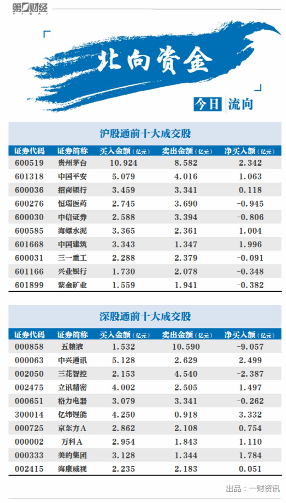 前十大成交股中,亿纬锂能、中兴通讯、贵州茅台分别获净买入3.33亿元、2.5亿元、2.34亿元。五粮液净卖出9.06亿元居首,三花智控、恒瑞医药分别遭净卖出2.39亿元、0.94亿元。