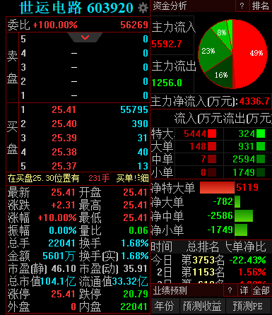 1月6日,世运电路连续第三日涨停,报25.41元,成交额5601万元,换手率1.68%。
