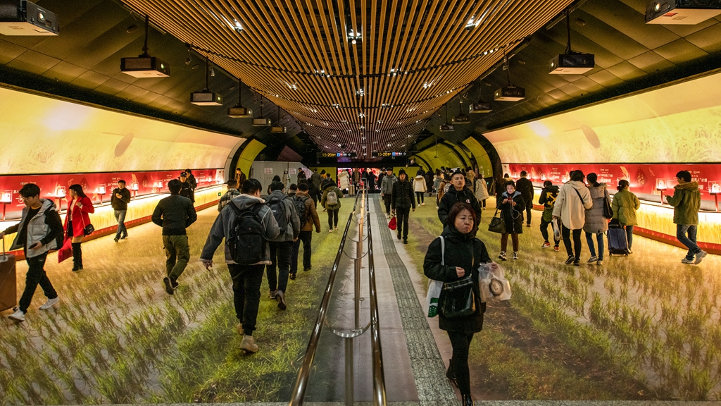 这片稻田所处的位置是上海地铁最繁忙的站点之一——徐家汇地铁站,稻田所在的换乘通道是上海地铁的地标,每天换乘客流达四十万。通道地面采用裸眼3D式的海水稻地贴使人仿佛置身稻田之间。结合两侧长达23米的巨型投影,让身处钢筋丛林的乘客们走进这条通道,身心感受到田园劳动的美好。同时,在两侧23米的长廊上,向乘客们真实展示了海水稻“本稻”。