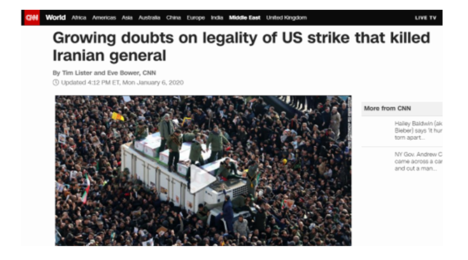 CNN同时指出,根据国际法,只有在非常有限的情况下,才允许进行有针对性的杀戮。一些法律专家质疑,白宫就袭击给出的理由是否符合这些标准。联合国一名庭外处决问题特别报告员艾格尼丝•卡拉马德(Agnes Callamard)表示,根据国际法,有针对性的杀戮是被允许的,但条件非常严格。她告诉CNN,自卫的理由只有在有证据表明即将遭遇武装袭击时才能生效,而且(反制)必须与威胁成比例。