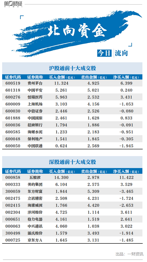 前十大成交股中,五粮液、贵州茅台、洋河股份分别获净买入11.42亿元、6.40亿元、3.61亿元。东方财富净卖出额居首,金额为3.47亿元,海康威视、中国联通分别遭净卖出2.65亿元、1.95亿元。