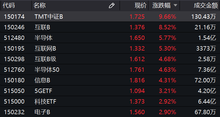 以电子为代表的科技股今日继续大放异彩,场内基金中,TMT中证B(150174.SZ)、互联B(150246.SZ)涨幅靠前,半导体(512480.SH)、半导体50(512760.SH)、信息B(150180.SZ)等涨幅均在4%以上,5GETF(515050.SH)、科技ETF(515000.SH)也有一定涨幅。