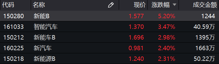 除了科技股外,补贴政策的稳定为新能源车板块添了一把火。智能汽车涨超3%,新能车B(150212.SZ)、新汽车基金(160225.SZ)以及新能源B(150218.SZ)涨幅均在2%以上。