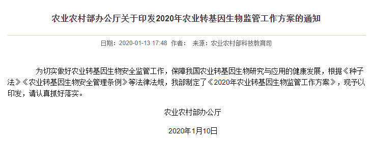1月13日,农业农村部办公厅印发2020年农业转基因生物监管工作方案。方案显示,强化研究试验源头监管,对农业转基因生物研发试验单位进行全程监管,确保试验材料可追溯。强化育种制种源头监管,对种子生产加工销售企业全覆盖监管,截断非法种植的源头。强化进口监管,对进口转基因生物全程管控。种子生产经营单位要加强对制种亲本和种子来源的管理,建立健全档案,确保源头和流向可追溯,严防非法生产经营转基因种子。