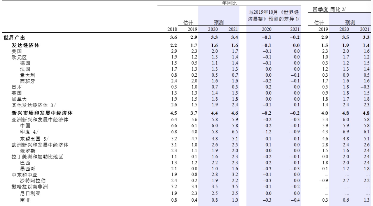 早在去年10月,IMF就预计全球经济在2020年将会企稳回升,只不过鉴于个别国家的拖累,IMF此次下调了当时的预期上调幅度,2020年3.3%的预计增速仍预示着全球经济正触底企稳。