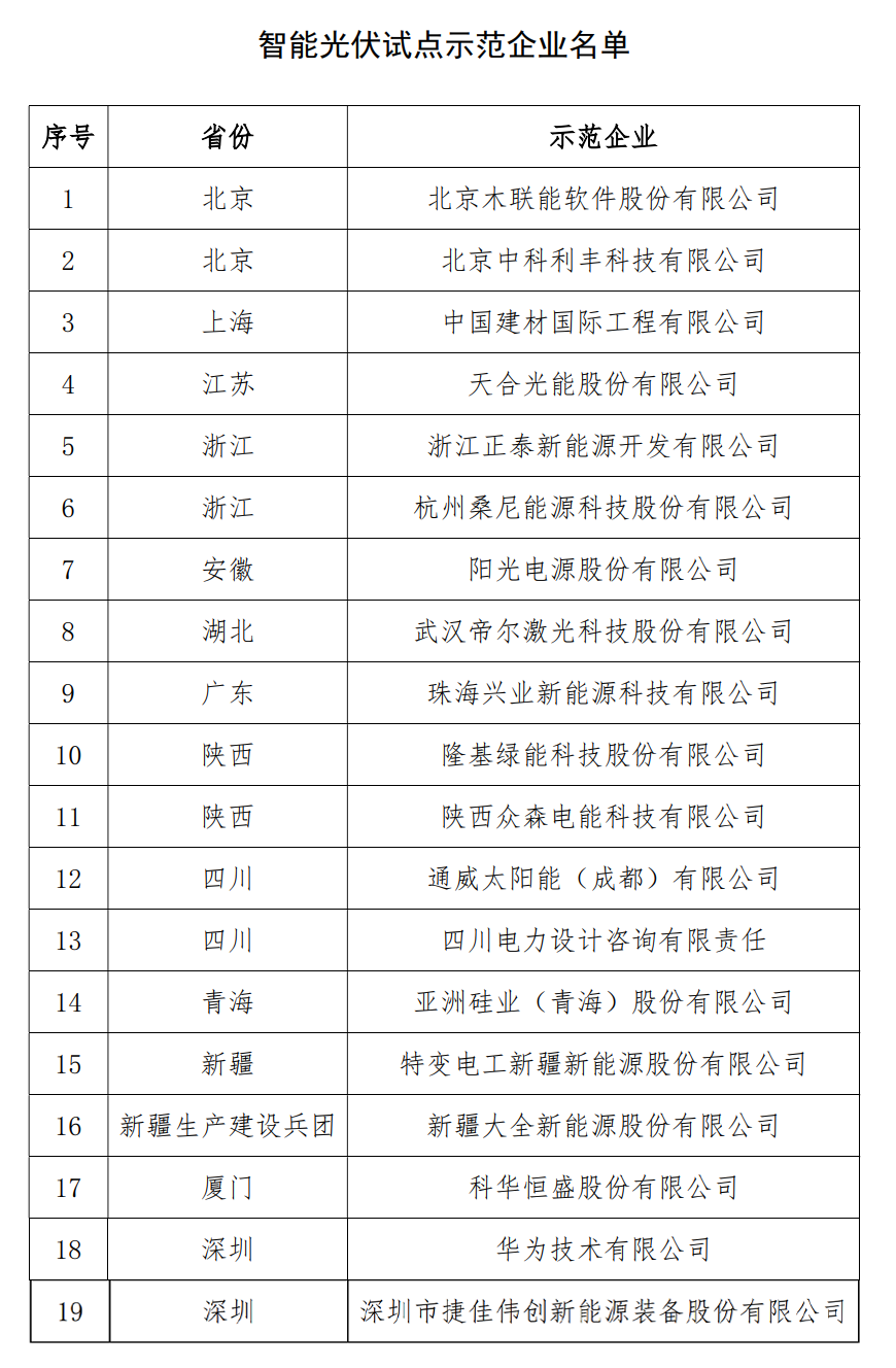 据工业和信息化部官网1月21日消息,为贯彻落实《智能光伏产业发展行动计划(2018—2020年)》(工信部联电子〔2018〕68号),根据《工业和信息化部办公厅 住房和城乡建设部办公厅 交通运输部办公厅 农业农村部办公厅 国家能源局综合司 国务院扶贫办综合司 关于开展智能光伏试点示范的通知》(工信厅联电子〔2019〕200号)有关要求,经省级有关部门推荐、专家评审等程序,工业和信息化部电子信息司将试点示范项目和试点示范企业名单予以公示。