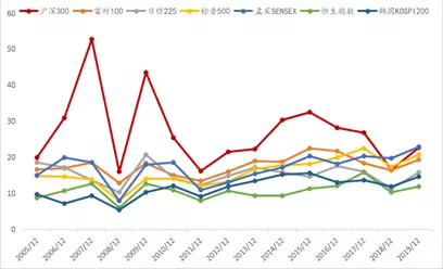 从上图中可以看出,全球主流股市的估值波动并不明显,而沪深300估值的中位数下限基本在20倍市盈率附近,明显要高于其他市场指数市盈率的中位数。但中位数的上限则变化较大,从50多倍市盈率到30多倍市盈率不等。也就是说,A股的过去15年的大部分时间里,都是处在高估值状态(中证500、中证1000估值的中位数水平更高)。