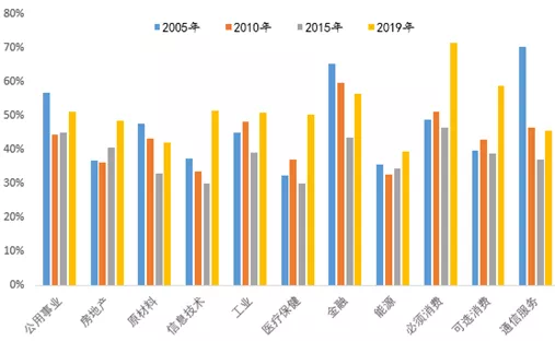 当中国经济增速持续下行,分化已经成为趋势。大部分行业的集中度都在提高,提升最明显的行业有:房地产、信息技术、医疗保健、必需消费、可选消费等。这意味着今后小公司翻身的难度越来越大,其估值水平还将进一步下降。