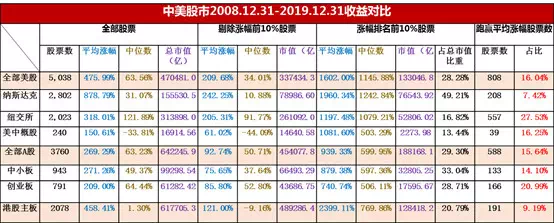 下面这张表建议大家认真研究一下。可以发现,从2008年至2019年末全球的主流股市,全部股票的中位数涨幅远低于平均数涨幅;跑赢平均涨幅的股票家数占比,绝大部分都不超过20%;涨幅前10%的股票,其涨幅都很惊人。