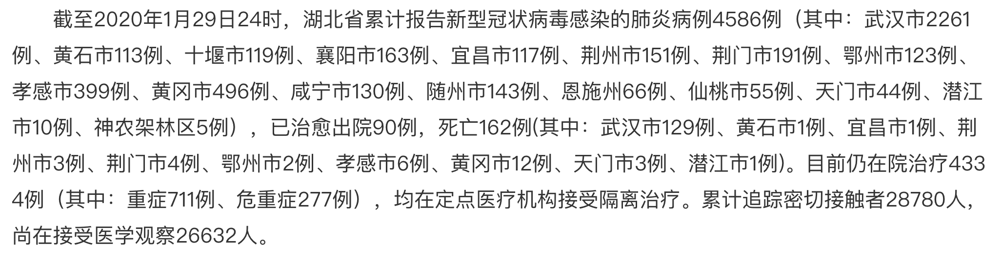 1月30日,根据湖北省卫健委披露的最新数据,截至2020年1月29日24时,湖北省累计报告新型冠状病毒感染的肺炎病例4586例,其中,武汉市2261例、黄冈市496例,已治愈出院90例,死亡162例,其中,武汉市129例、黄冈市12例。