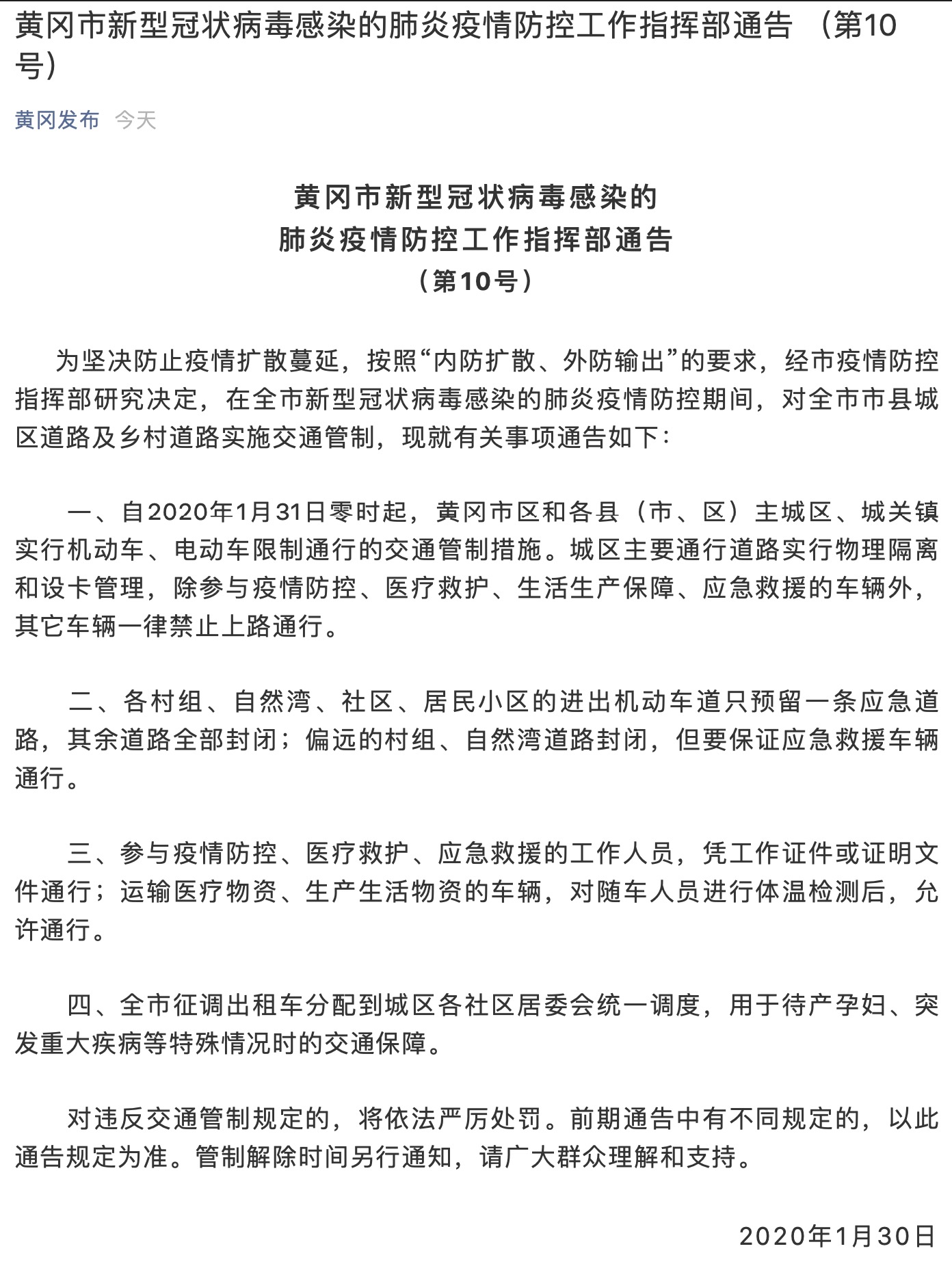 1月30日,黄冈市发布新型冠状病毒感染的肺炎疫情防控工作指挥部通告,根据通告,自2020年1月31日零时起,黄冈市区和各县(市、区)主城区、城关镇实行机动车、电动车限制通行的交通管制措施。城区主要通行道路实行物理隔离和设卡管理,除参与疫情防控、医疗救护、生活生产保障、应急救援的车辆外,其它车辆一律禁止上路通行。