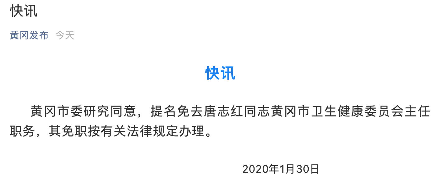 1月30日黄冈发布消息,黄冈市委研究同意,提名免去唐志红同志黄冈市卫生健康委员会主任职务,其免职按有关法律规定办理。