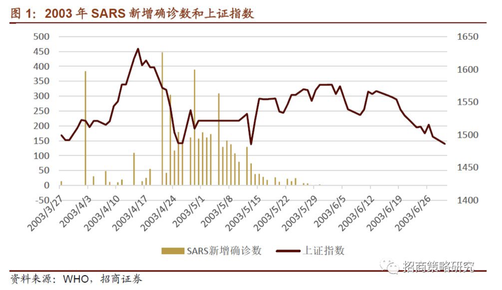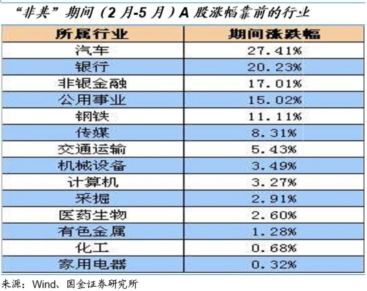 国金证券复盘03年“非典”期间A股行情表示,2003年“春节”(2月)至5月底,A股涨幅靠前的行业分别为“汽车、公用事业、钢铁、交运、机械设备”等。“非典”期间A股行业表现较差的行业主要集中在消费板块,如“商贸、休闲服务、纺织服装、食品饮料”等。