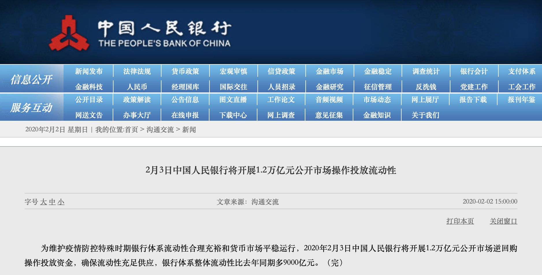 2月2日下午,央行发布通知,为维护疫情防控特殊时期银行体系流动性合理充裕和货币市场平稳运行,2020年2月3日中国人民银行将开展1.2万亿元公开市场逆回购操作投放资金,确保流动性充足供应,银行体系整体流动性比去年同期多9000亿元。