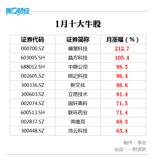 1月份深成指和创业板指的强势,让不少个股风生水起,在剔除最近半年上市的新股后,排名前十的牛股1月份涨幅翻倍的有2只,最低涨幅超过50%。从榜单来看,科技股霸屏,十大牛股中科技股占据多半。
