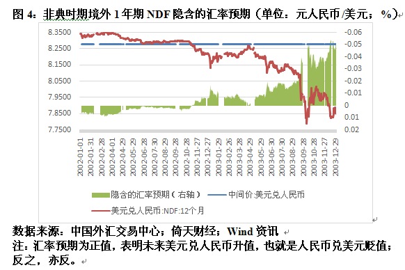 一个是看市场汇率预期。当时境外没有可交割的人民币外汇交易,境外人民币即期汇率(CNH)是2009年底跨境贸易人民币计价结算试点,自2010年起逐步发展起来的。但是,1998年起境外已经有了NDF交易,因此,可以用1年期NDF美元对人民币汇率远期汇率与境内汇率中间价的偏离来分析市场汇率预期。
