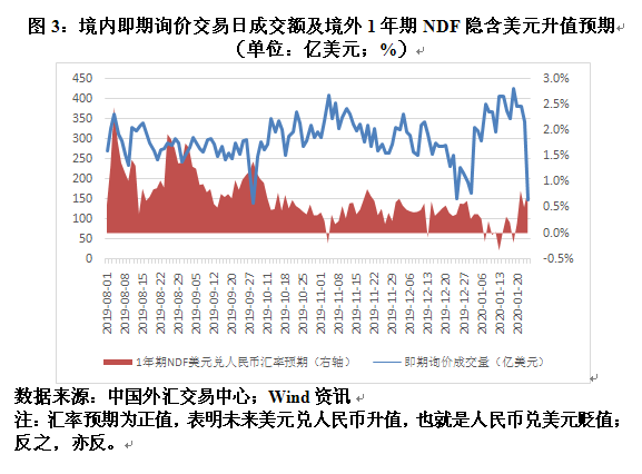 突发疫情造成了市场情绪波动,但未形成很强的贬值预期。从境外1年期无本金交割远期交易(NDF)隐含的美元对人民币升值预期看,1月21至23日平均为0.7%,高于1月初至20日间的均值0.1%,但低于去年8月5日(破“7”当日)至10月11日(第十三轮中美经贸磋商达成阶段性协议意向前夕)间的均值1.1%。从银行间外汇市场即期询价交易的日均成交看,21至23日为289亿美元,低于1月初至20日360亿美元的规模(见图3)。