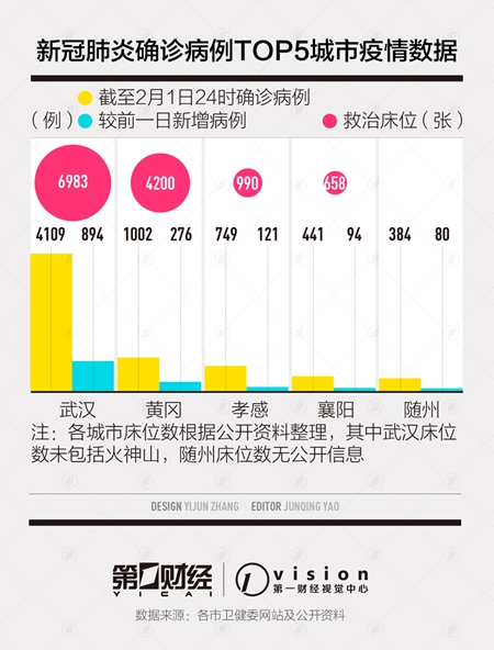 第一财经记者梳理各地数据发现,截至2月1日24时,在所有城市中,武汉(4109例)、黄冈(1002例)、孝感(749例)、襄阳(441例)、随州(384例)确诊病例位居全国前五,均在湖北省。
