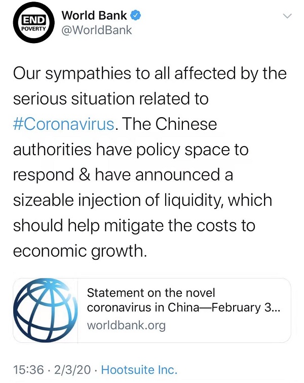 2月4日,世界银行日前称,对所有受到新型冠状病毒严重影响的人表示同情。中国当局有政策空间去应对,而且已经宣布一个相当大规模的流动性注入,这些都会有助于降低经济增长的成本。