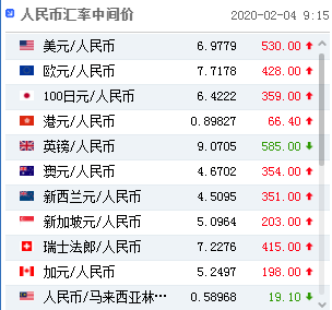 2月4日,人民币兑美元中间价调贬530个基点,报6.9779。