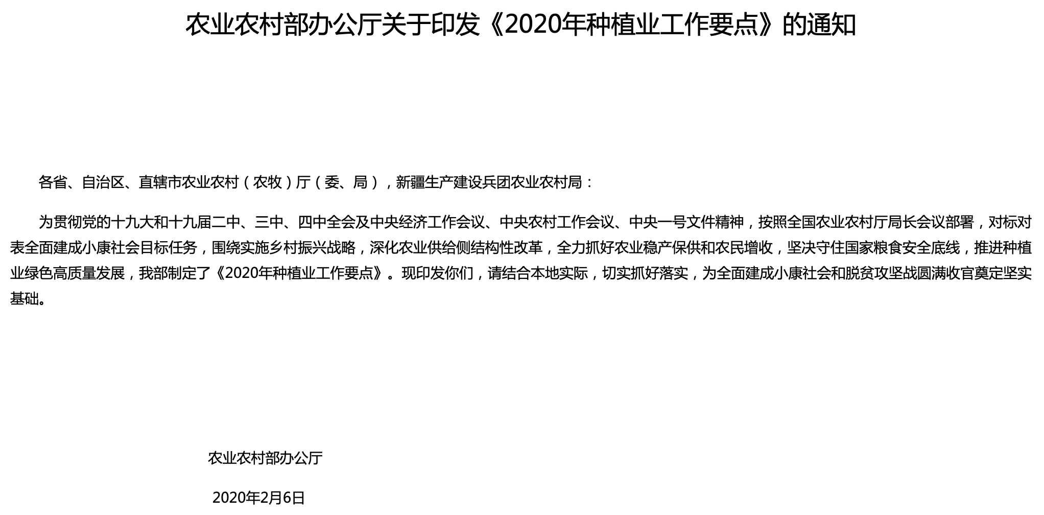 2月5日,2020中央一号文件《中共中央国务院关于抓好“三农”领域重点工作确保如期实现全面小康的意见》发布,文件中提到“稳定粮食生产”,强化粮食安全省长责任制考核,各省(自治区、直辖市)2020年粮食播种面积和产量要保持基本稳定;抓好草地贪夜蛾等重大病虫害防控,推广统防统治、代耕代种、土地托管等服务模式。