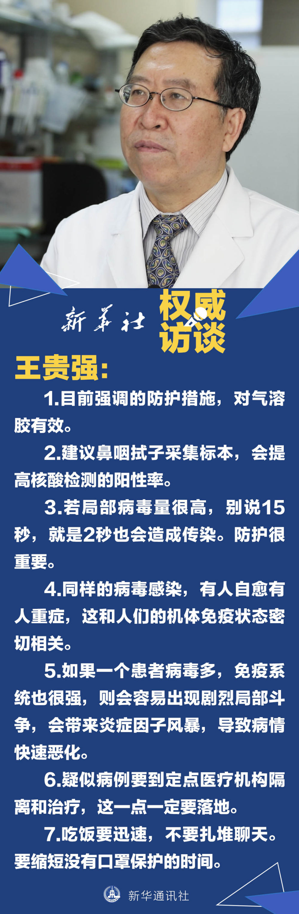 王贵强:这个病毒总体来说传染性是比较强的,15秒接触造成传播是完全可能的。如果没有防护,局部病毒量又很高,不在于多长时间,一句话工夫飞沫就可能到了,你就被感染了。别说15秒,2秒也会造成传染,所以防护很重要。