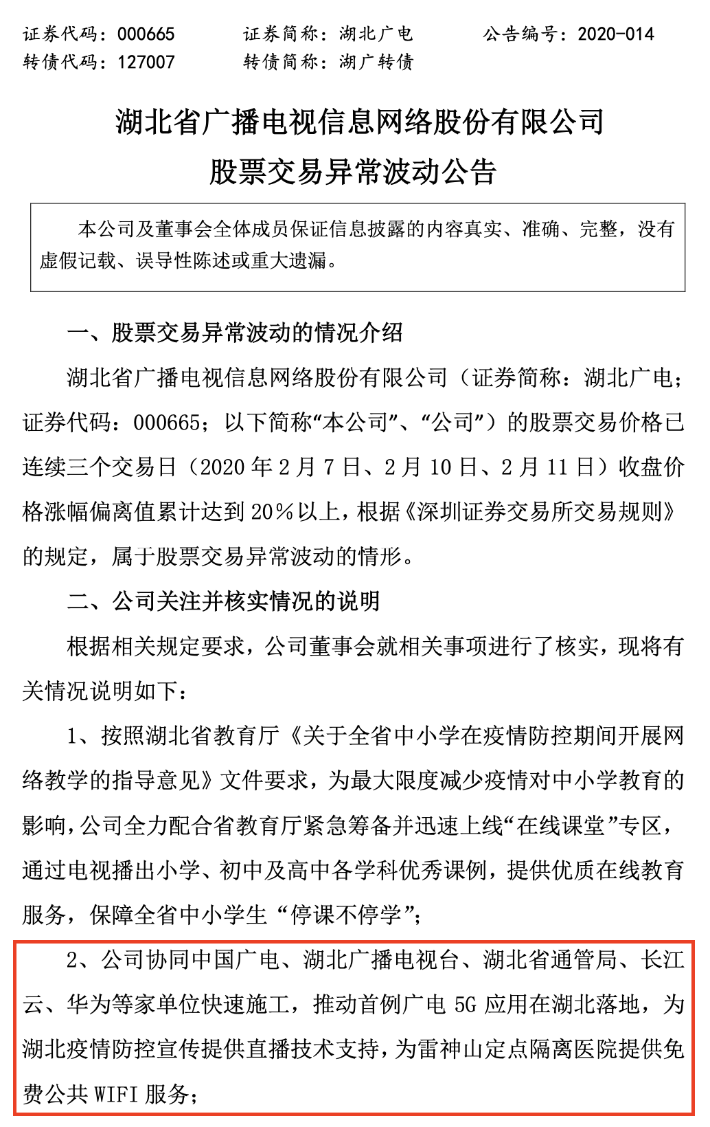 2月11日,湖北广电晚间公告称,公司协同中国广电、湖北广播电视台、湖北省通管局、长江云、华为等单位快速施工,推动首例广电5G应用在湖北落地,为湖北疫情防控宣传提供直播技术支持,为雷神山定点隔离医院提供免费公共WIFI服务。