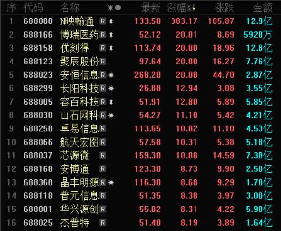 涨幅方面,截至收盘,新股映翰通(688080.SH)收报133.50元/股,全天收涨383.17%;此外,博瑞医药(688166.SH)、优刻得(688158.SH)、聚辰股份(688123.SH)、安恒信息(688023.SH)等4股涨停,长阳科技(688299.SH)、山石网科(688030.SH)、卓易信息(688258.SH)、航天宏图(688066.SH)等多股涨逾10%,30只科创板个股涨幅超5%。