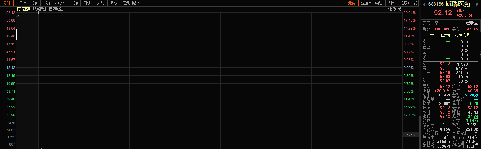 涨停个股方面,主板云计算板块的大涨,让科创板个股优刻得、安恒信息双双涨停,山石网科、卓易信息涨幅均超10%。另外,博瑞医药开盘涨停,截至收盘,报收于52.12元/股。