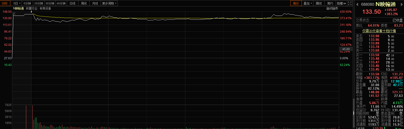值得注意的是,今日上市新股映翰通开盘上涨412.20%,截至收盘,股价报133.50元/股,涨幅收窄至383.17%,全天成交量979.40万股,成交额12.90亿元,换手率82.12%。