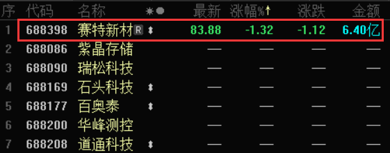 跌幅方面,赛特新材(688398.SH)是科创板今日唯一收跌个股,截至收盘,报收于83.88元,微跌1.32%。值得注意的是,昨日,赛特新材、广大特材(688186.SH)同时上市科创板,首日涨幅均超200%,另一只个股广大特材今日微涨2.39%。