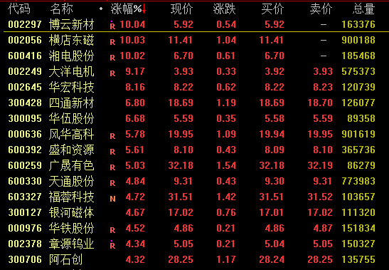 盘面上,稀土永磁概念今日多股涨停。截至收盘,博云新材、横店东磁、湘电股份涨停,盛和资源、广晟有色、风华高科涨超5%。
