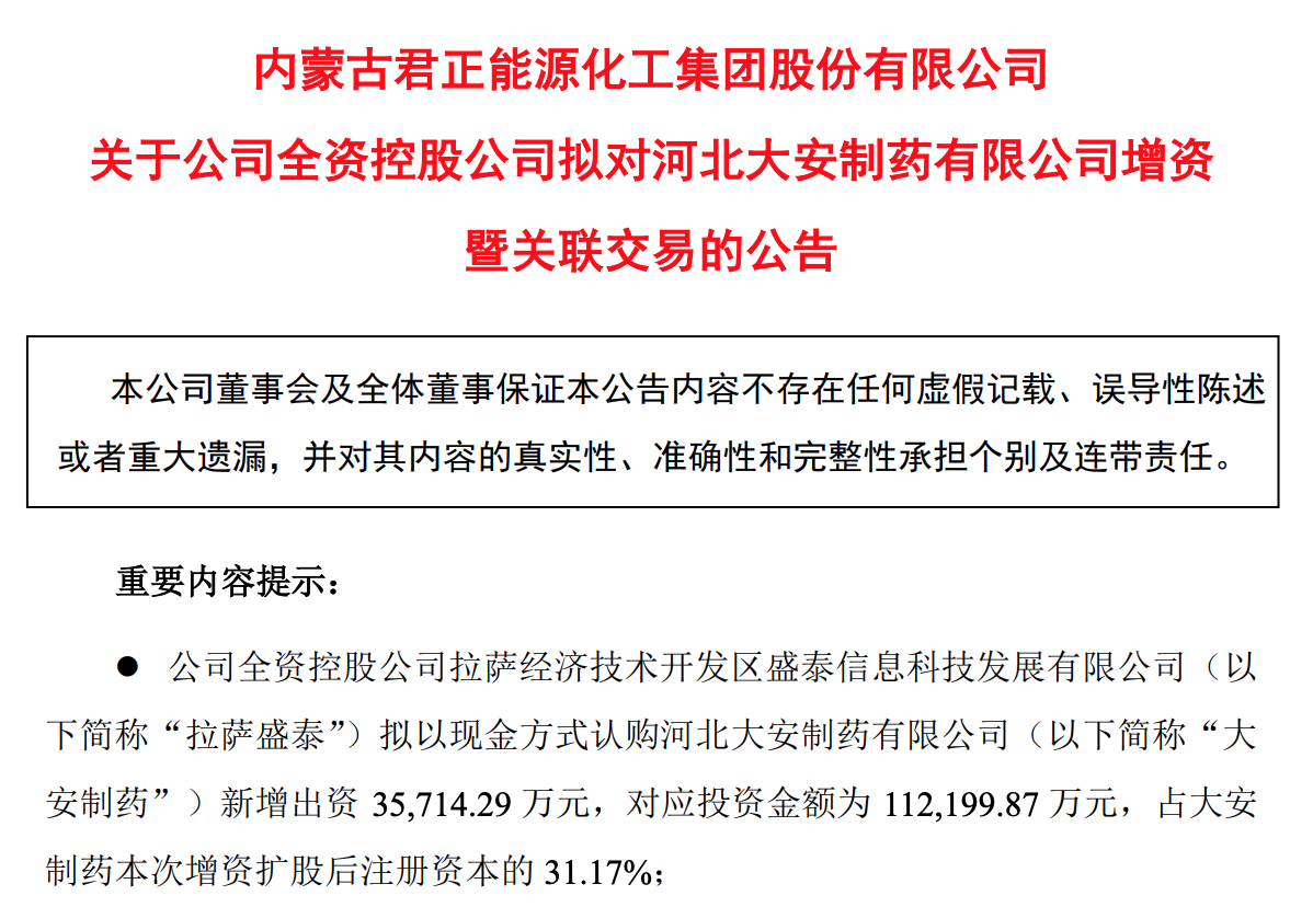 2月17日晚间,君正集团公告,公司全资控股公司拉萨盛泰拟11.22亿元认购大安制药新增出资3.57亿元,对应投资金额为11.2亿元,占大安制药增资扩股后注册资本的31.17%。