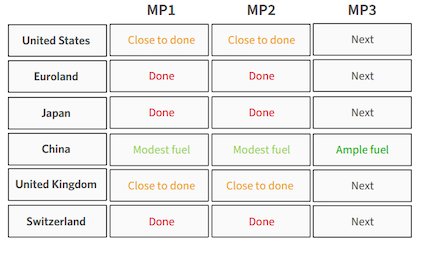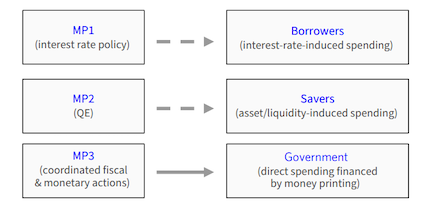 随着时间的推移,扩张性的财政政策如箭在弦。桥水将货币政策(MP)阶段分为三个——MP1:利率政策,面向借款者,通过利率吸引支出;MP2:QE,面向储蓄者,通过资产和流动性吸引支出;MP3:货币与财政协调,面向政府,通过直接的货币化融资进行支出。