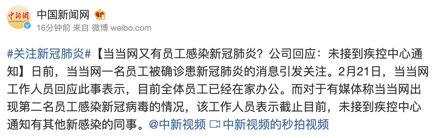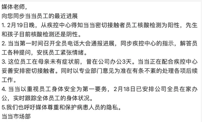 2月19日晚间,当当网召开内部电话会议,向全体员工传达此前母亲确诊新冠肺炎的员工最新一次核酸测试呈阳性,即确诊该员工为新冠肺炎,当当网即刻通知本周公司全体员工在家办公。