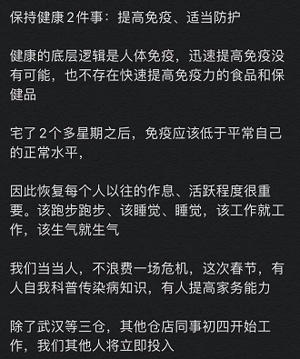 此前的2月9日,当当曾因一封当当网董事长兼CEO俞渝“坚决要求员工到岗办公”的内部信引发外界讨论。俞渝在心中表示新冠肺炎并不可怕,多数病人病情较轻,同时将免疫力下降和“宅”在家关联起来,呼吁员工及早复工“增强免疫力”。