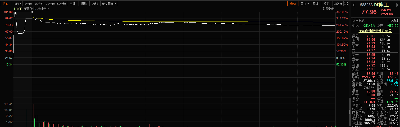 同时今日科创板上市的还有神工股份,开盘上涨315.32%,截至收盘涨259.76%,报77.97元/股,全天成交量2708.98万股,成交额22.61亿元,换手率74.08%。
