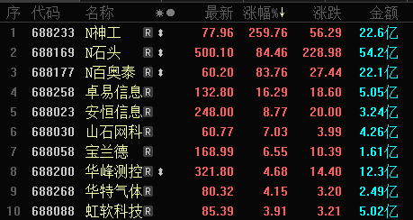 涨幅方面,新股神工股份(688233.SH)涨259.76%,新股石头科技(688169.SH)涨84.46%,新股百奥泰(688177.SH)涨83.76%,卓易信息(688258.SH)涨幅超10%,安恒信息(688023.SH)、山石网科(688030.SH)、宝兰得等7只科创板个股涨幅超5%。